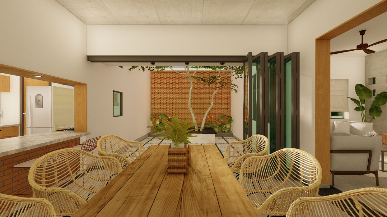 The parametric rippled brick wall takes center stage on the facade in the courtyard creating a dynamic visual rhythm. Complementing this are square perforations, adding texture and elegance to the structure while ensuring practical functionality.